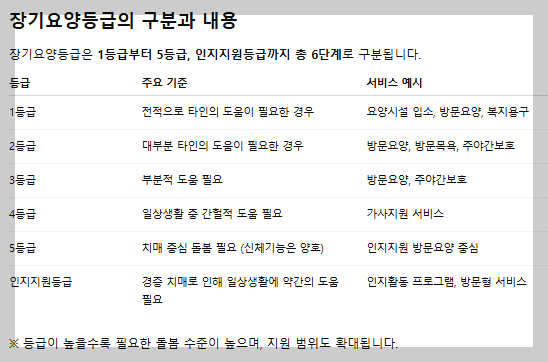 ※ 등급이 높을수록 필요한 돌봄 수준이 높으며, 지원 범위도 확대됩니다.