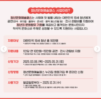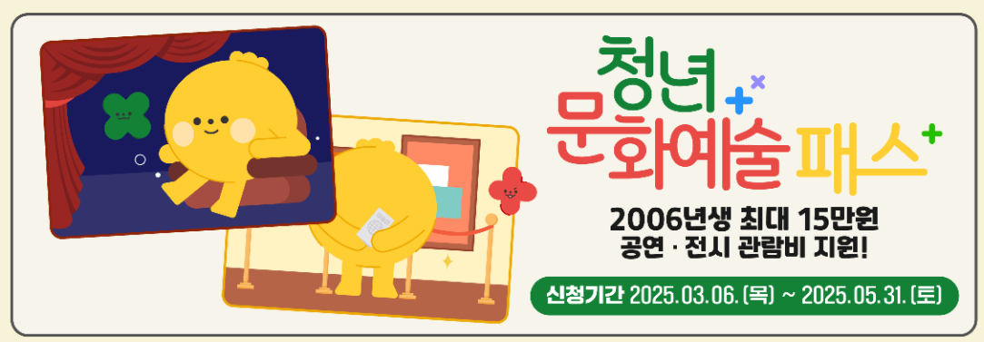 청년 문화예술패스는 대한민국 정부가 주관하여 청년들이 문화예술 활동에 참여할 수 있도록 지원하는 제도입니다. 이 패스를 통해 최대 15만원까지 공연 및 전시 관람비를 지원받을 수 있습니다. 특히, 2006년생 청년들이 주요 대상이 되어, 최대 16만 명만 선착순으로 신청 가능합니다.