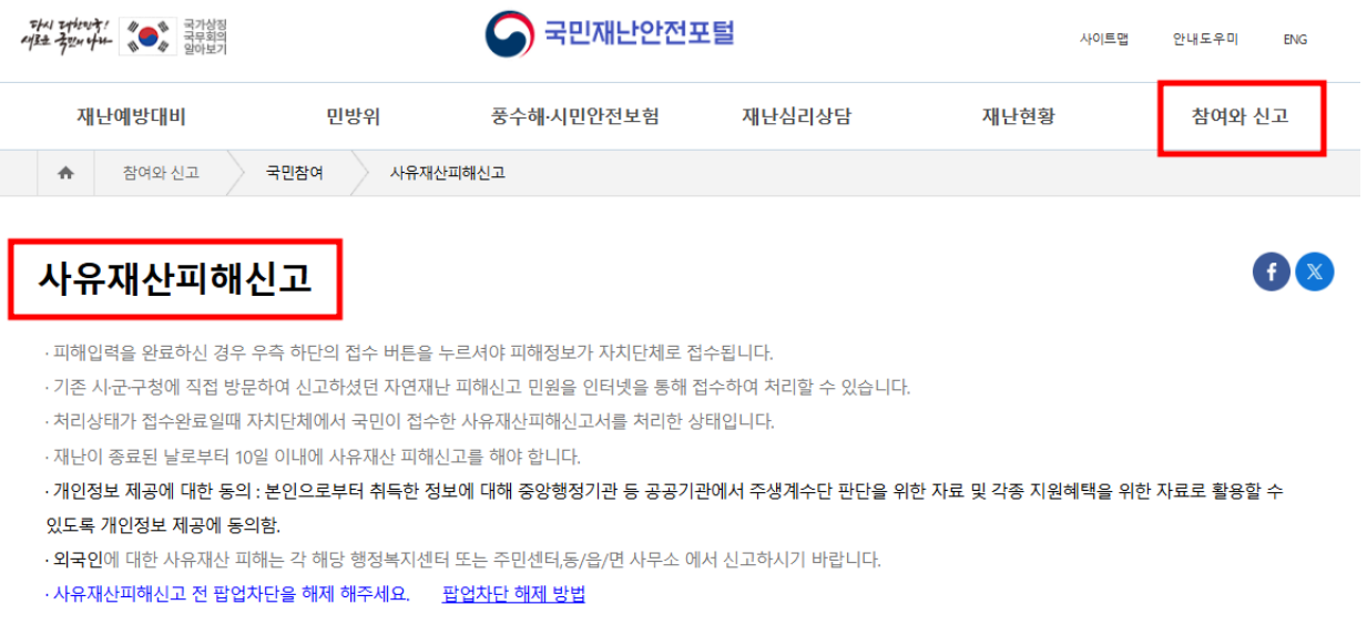✅국민재난안전포털 > 참여와 신고 > 사유재산피해신고 👆 바로가기 클릭