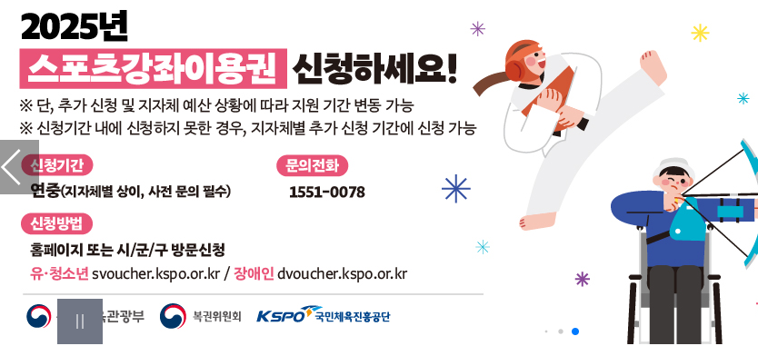 이런 상황을 고려해 문화체육관광부와 국민체육진흥공단은 저소득층 유·청소년과 장애인을 대상으로 운동을 마음껏 할 수 있도록 지원하는 ‘스포츠강좌이용권’(일명 스포츠 바우처) 제도를 운영하고 있습니다.