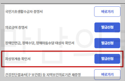 증명서 발급 메뉴로 이동하면 여기서 차상위 계층 확인서 발급 신청 클릭