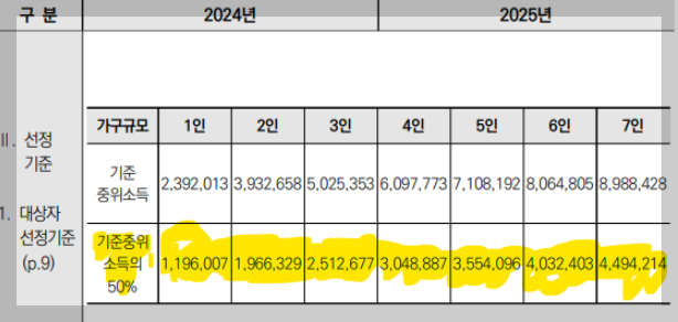 예를 들어 2025년 기준, 4인 가구 기준 중위소득 50%는 약 278만 원 수준입니다.