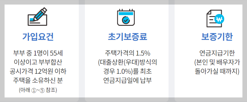 2. 주택보유수 : 부부기준 공시가격 등이 12억 원 이하 주택소유자(다주택자라도 합산 가격이 12억이하면 가입 가능, 공시가격 등이 12억원 초과 2 주택자는 3년 이내 1 주택 처분 시 가입 가능)